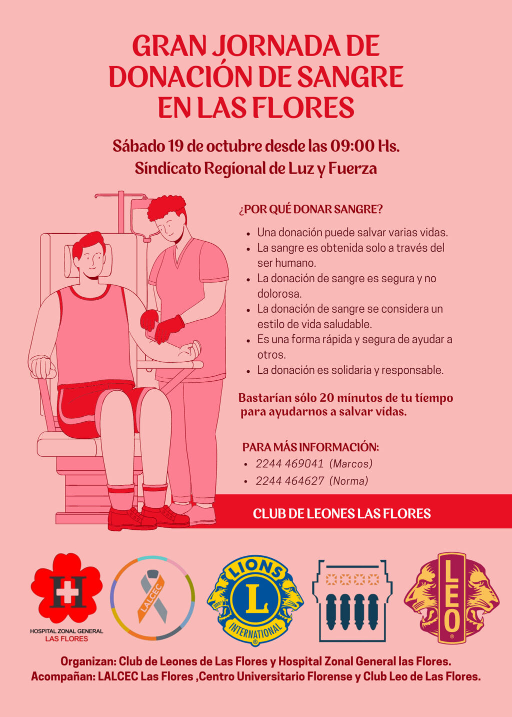 Será el sábado 19 de octubre desde las 9hs. en el Sindicato Regional de Luz y Fuerza organizado por el Club de Leones y el Hospital Zonal General Las Flores con el acompañamiento de Lalcec Las Flores, Centro Universitario Florense y Club Leo de nuestra ciudad. «Bastarán sólo 20 minutos de tu tiempo para ayudarnos a salvar vidas», indicaron los organizadores mediante las redes sociales. Para más información comunicarse al 2244-469041 (Marcos) o al 2244-464627 (Norma).