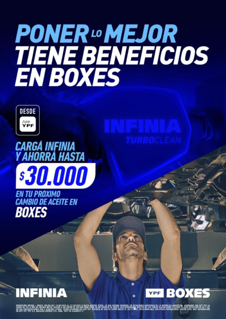 Acelerá y anda a YPF de Ferraro y Cia. porque lanzaron una nueva promo en BOXES…Si, si cargas 25 litros de INFINIA 25 o más, podrás acceder a un cupón de descuento de $30.000.- para utilizar en cualquier BOXES, exclusivamente en aceites sintéticos ELAION AURO y ELAION F5…Promociones que no te podes perder con la aplicación de YPF. Vení que te ayudamos. Rivadavia y C. Marqués.