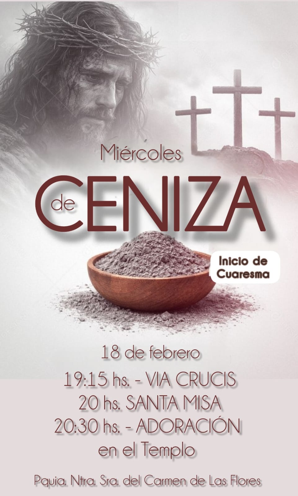 Secretaría Parroquial invita a la comunidad a participar de la misa por el «Miércoles de Cenizas», que abre el camino a la cuaresma. La misma se celebrará este miércoles 18 de febrero a las 20hs. en nuestro Templo Parroquial. En dicha misa, como se hace todos los años se impondrán las cenizas, que es un símbolo de penitencia y que deseamos ser cada vez mejores cristianos comprometidos por lograr vivir mejor y en paz. Previamente, desde las 19:15hs. se realizará el Vía Crucis.