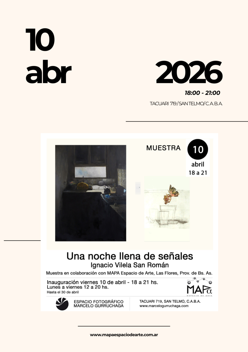 «MAPA» Espacio de Arte anunció que este viernes 10 de abril a las 18hs. en el Espacio Fotográfico «Marcelo Gurruchaga», ubicado en calle Tacuarí 719 del barrio porteño de San Telmo, se presentará la primera muestra individual del artista florense Ignacio Vilela San Román. Dicha exposición es una instalación pictórica que ensambla pinturas, textos ajenos y personales, imágenes editadas, dibujos y objetos. Están todos invitados a participar.