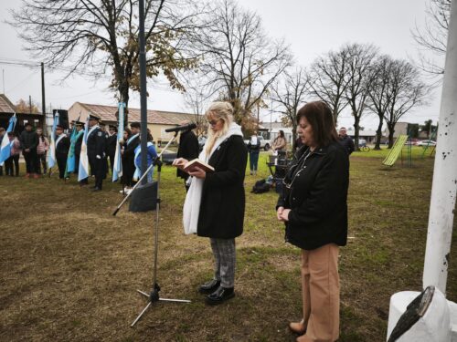En una mañana con neblina, se llevó a cabo en la “Plaza de las Provincias” del Barrio 25 de Mayo ubicada entre Santa Fe y Catamarca el tradicional acto. Con la presencia de distintas autoridades encabezado por el intendente Alberto Gelené, el Pte. del HCD Fabián Blanstein, escolares, fuerzas vivas y algunos vecinos, se inició con el izamiento de la bandera nacional en el mástil central. Se entonó las estrofas del himno nacional argentino, para luego escuchar la palabra eclesiástica de las ministros de la eucaristía Mercedes y Graciela.