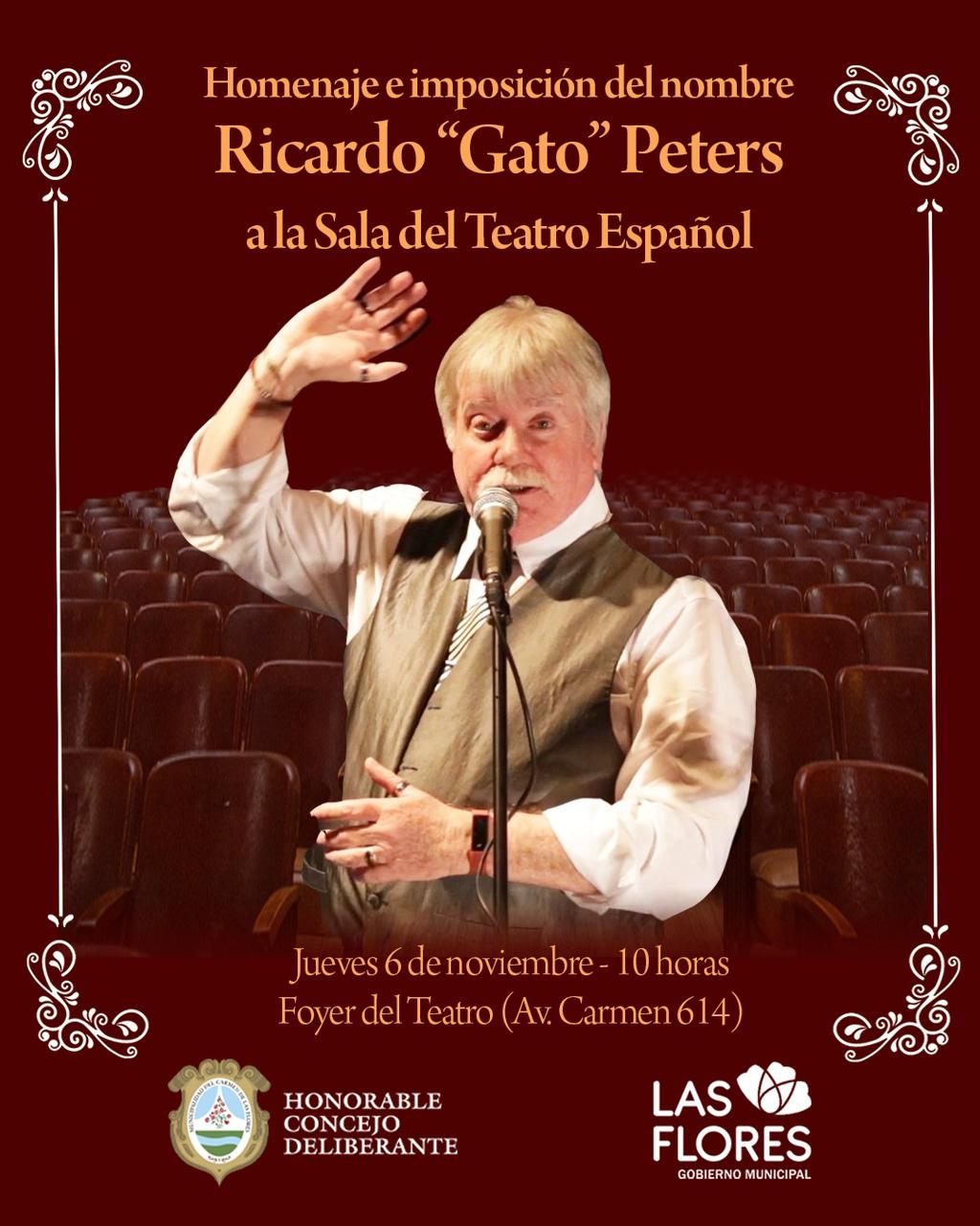 Mañana jueves 6 de noviembre en el Foyer (antesala) del Teatro Español de nuestra ciudad a las 10 de la mañana se realizará el acto de imposición del nombre Ricardo “Gato” Peters a la sala principal del histórico edifico de la avenida Carmen 614. La iniciativa que ha determinado reconocer la figura del humorista fue gestada en el Concejo Deliberante de Las Flores y aprobada por unanimidad mediante la ordenanza Nº 3554 del año 2023. Además de las autoridades municipales, se espera para mañana la presencia de familiares y allegados, quienes estarán presentes en el emotivo momento donde se descubrirá una placa recordatoria que, con el nombre Ricardo “Gato” Peters, honrará por siempre la sala del Teatro Español de Las Flores.