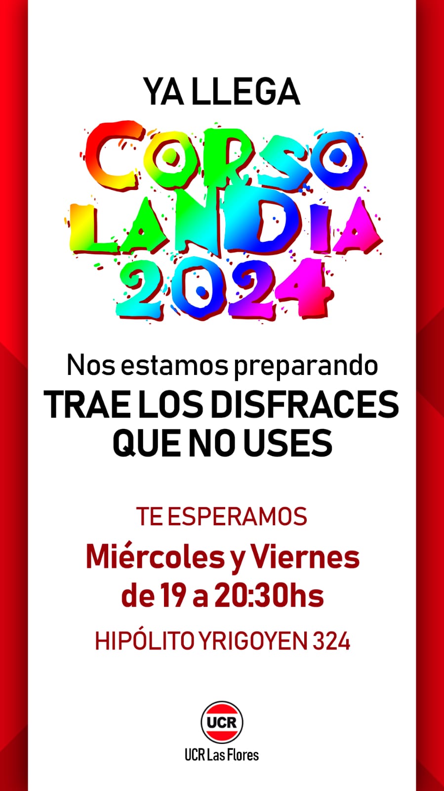 Con motivo de acercarse la fecha de la realización de Corsolandia 2024, esta semana y la próxima, en el comité de la UCR se van a estar recibiendo disfraces que estén en buen estado, para luego realizar una feria y que cada niño pueda participar del carnaval infantil.