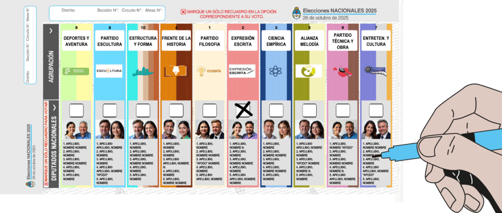 Aunque parezca engorrosa la nueva boleta para realizar el voto, será simple, ya que luego de que el presidente de mesa le entrega la misma que contiene a todos los candidatos de esta provincia, el ciudadano se dirigirá a un semi cuarto oscuro que le indicarán o biombo que le da cierta privacidad, elige con una marca el candidato con un tilde, o cruz y cierra la boleta doblandola quedando la imagen de los candidatos hacia adentro, se inserta en la urna y el Pte de mesa le devuelve el dni.