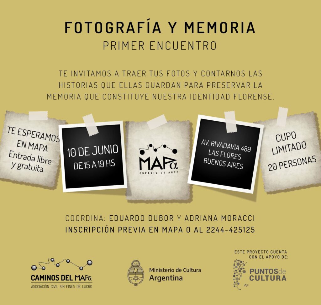 Mapa Espacio de Arte fue seleccionado a través del Ministerio de Cultura de Nación a integrar Puntos de Cultura con el proyecto “FOTOGRAFIA: memoria de una construcción colectiva”, de Adriana Moracci y Eduardo Dubor. El proyecto propone realizar encuentros participativos sin límite de edad, dirigido y abierto a todas las personas que quieran compartir sus fotografías personales, álbumes familiares, de agrupaciones, organizaciones o clubes, para contribuir a dejar testimonios escritos de las imágenes compartidas, ya que las fotografías narran la historia, costumbres, lazos sociales, crecimiento urbanístico y demográfico de nuestra ciudad. De esta manera abrimos una CONVOCATORIA para quienes tengan interés en participar. Pueden inscribirse de miércoles a sábados en Mapa de 10 a 12 y de 17 a 19 hs en Rivadavia 489 hasta el 8 de junio inclusive. ( o a través del WhatsApp 2244-425125). El primer encuentro se realizará en el Espacio Experimental de MAPA, el SÁBADO 10 de JUNIO de 15:00 a 19:00 hs. Se compartirán historias y narraciones sobre las fotografías que los participantes nos acerquen, provocando el diálogo y la concientización, de que cada uno de nosotros conserva tesoros fotográficos que forman parte de la historia de la sociedad en la que vive, fomentando así los lazos comunitarios entre las distintas generaciones. Con esta Convocatoria  proponemos tomar conciencia de la importancia de la fotografía como construcción de la memoria colectiva y comunitaria, participando activamente en la preservación de la memoria de Las Flores. Consideramos que la memoria es un tesoro comunitario que se preserva por la voluntad y el trabajo con las comunidades. El proyecto incluye una futura exposición en MAPA con fecha a determinar. PARTICIPACIÓN LIBRE Y GRATUITA. Cupos limitados a 20 personas. Esperamos tu INSCRIPCIÓN para formar parte de estas rondas de encuentros!