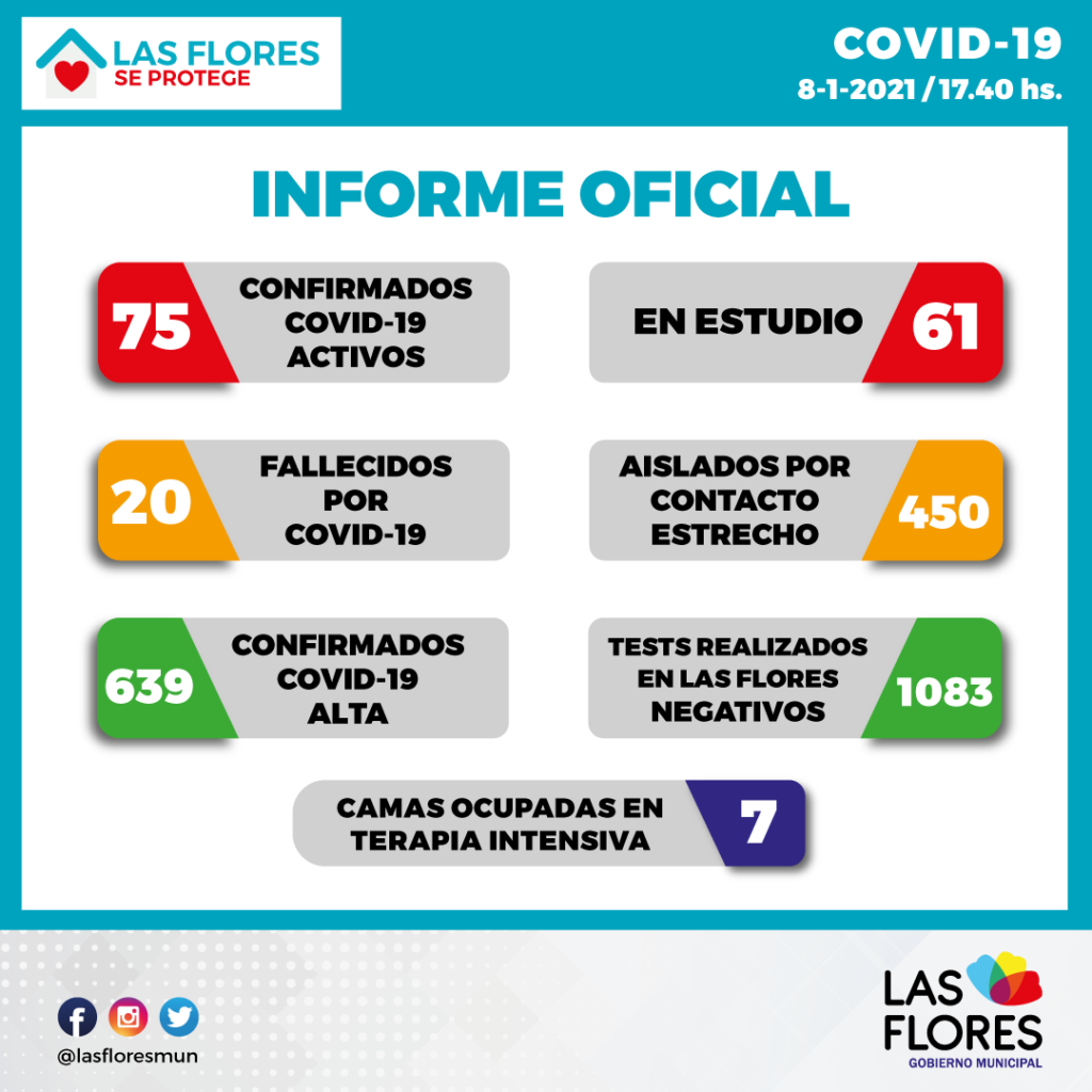 En el día de hoy ingresaron nuevos resultados, arrojando 11 positivos, 8 por medio de hisopados PCR y 3 por test de antígeno, anosmia y 3 resultados negativos. Además, en las últimas horas se dieron de alta a 5 pacientes activos de Covid-19. Al día de la fecha hay un total de 75 casos activos por Covid-19. También comunicamos que hay 61 casos en estudio. En aislamiento por contacto estrecho hay un total de 450 personas aisladas. En el hospital se encuentran 7 pacientes ocupando cama en terapia intensiva. Es importante que no dejemos de cuidarnos, y continuemos usando el tapaboca, manteniendo la distancia social y una buena higienización de manos. EN ESTOS MOMENTOS LA SALA DE CLÍNICA DEL HOSPITAL SE ENCUENTRA CON MUCHOS PACIENTES CON COVID-19.