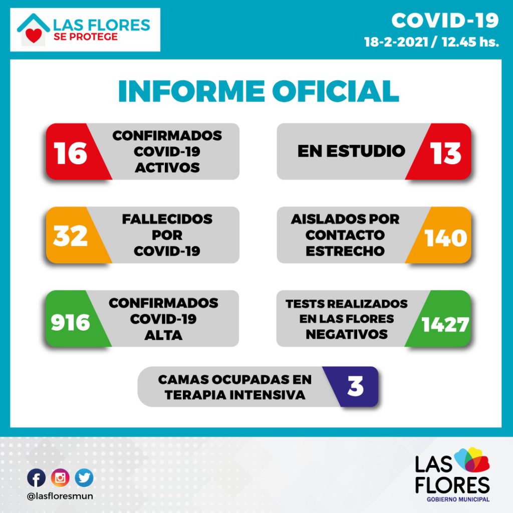 En el día de hoy ingresaron 5 resultados negativos. Además, en las últimas horas se dieron de alta a 4 pacientes activos de Covid-19. Al día de la fecha hay un total de 16 casos activos por Covid-19. También comunicamos que hay 13 casos en estudio. En aislamiento por contacto estrecho hay un total de 140 personas aisladas. En el hospital se encuentran 3 pacientes ocupando cama en terapia intensiva. Es importante que no dejemos de cuidarnos, y continuemos usando el tapaboca, manteniendo la distancia social y una buena higienización de manos. Evitemos el contagio. #EntreTodosNosCuidamos #LasFloresSeProtege
