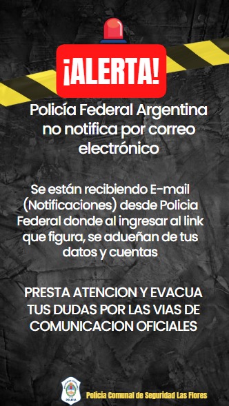 La Estación Policía Comunal Las Flores informa que se están recibiendo e-mail (notificaciones) desde Policía Federal donde, al ingresar al link que figura, se adueñan de datos y cuentas bancarias. Se solicita prestar atención y evacuar dudas por las vías de comunicación oficiales.