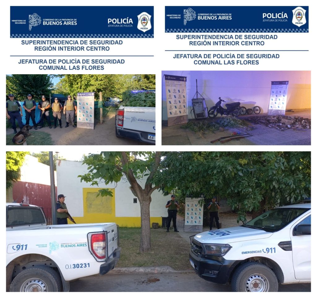 En el día de ayer viernes personal policial de esta Dependencia cuando recorría la jurisdicción por Avenida Independencia y calle Larralde procedió a la aprehensión de dos masculinos, de 38 y 24 años de edad, domiciliados en esta ciudad, quienes fueron sorprendidos egresando del deposito de chatarras “Lo Grosso” llevando consigo bolsas que contenían hierros varios, habiendo accedido al predio tras haber roto chapas que delimitaban el lugar. Tales sujetos fueron alojados en este elemento policial y puestos a disposición de la justicia, procediéndose al recogimiento de los efectos sustraídos y de una motocicleta marca Zanella, ZB 110 dominio colocado 544-GPW con la cual se movilizaban, labrándose asimismo infracción de tránsito sobre esta.- En consecuencia de dio inicio a actuaciones judiciales por el delito de ROBO INFRAGANTI DELITO y DESOBEDIENCIA con la intervención de la Ayudantía Fiscal Local. Con la prosecución de la investigación en la fecha se cumplimentaron dos órdenes de registro, allanamiento y secuestro libradas por el Juzgado de Garantías Nº 3 del Dpto. Judicial Azul para con los domicilios sito Avenida Carmen e/ Alvear y Carlos Tejedor donde se incautó chatarras varias, telefonía celular y dos armas largas con su respectiva cartuchería, y Rivadavia e Islas Malvinas donde se logró secuestrar 5 plantas de marihuana, telefonía celular y chatarras varias.- Por lo expuesto se iniciaron paralelamente nuevas actuaciones judiciales por los delitos de TENENCIA DE ARMA DE USO CIVIL SIN LA DEBIDA AUTORIZACIÓN e INFRACCION A LA LEY 23.737 con la intervención de la Ayudantía Fiscal Local y UFI Nº 22 respectivamente, ambos del Dpto. Judicial Azul.