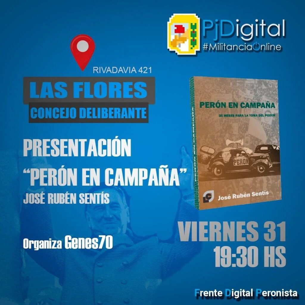 El próximo viernes 31 de marzo a las 19:30hs. en el salón «Dr. Oscar Alende» será presentado el libro «Perón en Campaña: 35 meses para la toma del poder», cuya autoría pertenece a José Rubén Sentis, comunicador digital, director propietario del semanario tandilense «El Espejo» y ex presidente del PJ Tandil, entre otros logros. El libro está basado en los orígenes peronistas y la construcción del mencionado movimiento. El evento está organizado por «Genes70», un ámbito creado espontáneamente el pasado 11 de marzo en el festejo por los 50 años del triunfo del FREJULI.