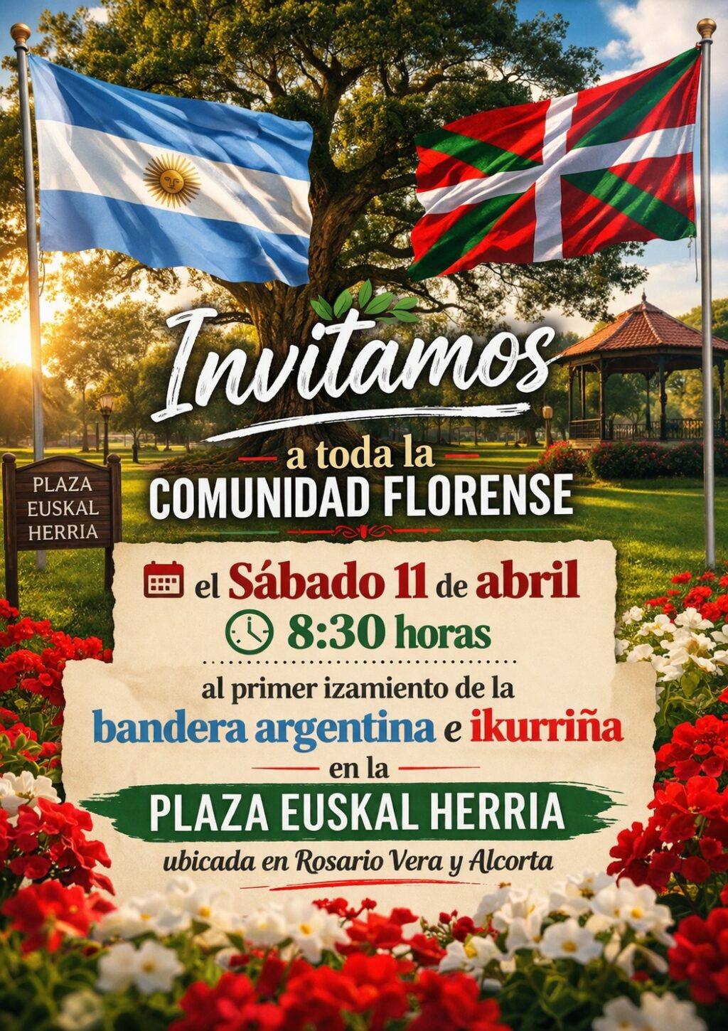 El Centro Vasco florense invita a la comunidad al primer izamiento de la bandera argentina e ikurriña que tendrá lugar este sábado 11 de abril a las 8:30hs. en la Plaza «Euskal Herria», ubicada en Rosario Vera y Alcorta. La ikurriña es la bandera del País Vasco, diseñada por Sabino y Luis Arana en 1894 originalmente como símbolo de Bizkaia. La misma está compuesta por un aspa verde (independencia/roble de Gernika) y una cruz blanca (cristianismo) sobre fondo rojo (pueblo vasco). Oficializada en 1936, prohibida por Franco, fue legalizada en 1977 y es oficial desde 1979.
