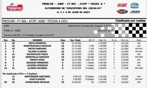 Eso es lo que colocó en el portal de face cuando explotó de alegría al consagrarse campeón en la ciudad entrerriana. Con casi 2 segundos por delante del más inmediato perseguidor Agustín Mastropaolo. De esta manera, Federico «Colo» Izeta se queda con la edición N° 4 con su Fiat 1 en entre Ríos. Felicitaciones…!
