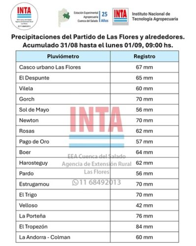 (ver cuadro) La Agencia de Extensión Rural de INTA Las Flores informa a la comunidad el registro parcial de precipitaciones del Partido de Las Flores (casco urbano y parajes rurales) correspondiente a este lunes 1 de septiembre hasta las 9hs.