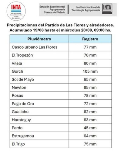 (ver cuadro) La Agencia de Extensión Rural de INTA Las Flores informa a la comunidad el registro parcial de precipitaciones del Partido de Las Flores (casco urbano y parajes rurales) correspondiente a este miércoles 20 de agosto hasta las 9hs. Nuevo dato: hasta las 13hs. la lluvia caída en el casco urbano era de 89mm.
