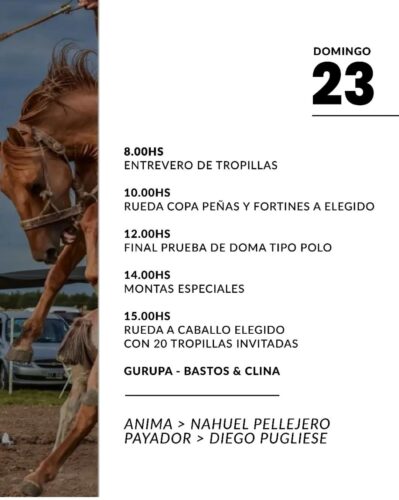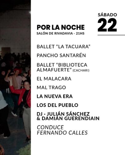 (ver cronograma) En el marco de una rueda de prensa que tuvo lugar este jueves en el salón rojo municipal fue presentada oficialmente una nueva edición del festival declarado de interés nacional y que se realizará los días viernes 21, sábado 22 y domingo 23 de noviembre en el campo de doma del Centro Tradicionalista «La Tacuara». Luego de la bienvenida a cargo del intendente municipal interino, Prof. Fabián Blanstein, hizo uso de la palabra Marcelo «Cata» Mundet, integrante de la Comisión Organizadora, quien explicó que «todo comenzará el día viernes en nuestro salón de Avda. Rivadavia con mucho folklore, todos los ballets locales y danzas tradicionales como estamos acostumbrados todos los años. En cuanto a los números artísticos estarán Los Hnos. Sondón, La Patio ‘e Tierra, La Kachi Band (Rauch), Agrupación Bahía (Cañuleas) y además durante el viernes y sábado la tradicional Noche de los Jóvenes». Por otra parte, Mundet confirmó que «habrá una actividad nueva en el campo de doma y es una Prueba tipo Polo que es algo que se está practicando mucho en la zona. Por supuesto que estarán las otras pruebas ya conocidas. La idea es comenzar el sábado bien temprano». Como novedad se anunció un bono por los tres días de Peñas y Fortines a 20 mil pesos.