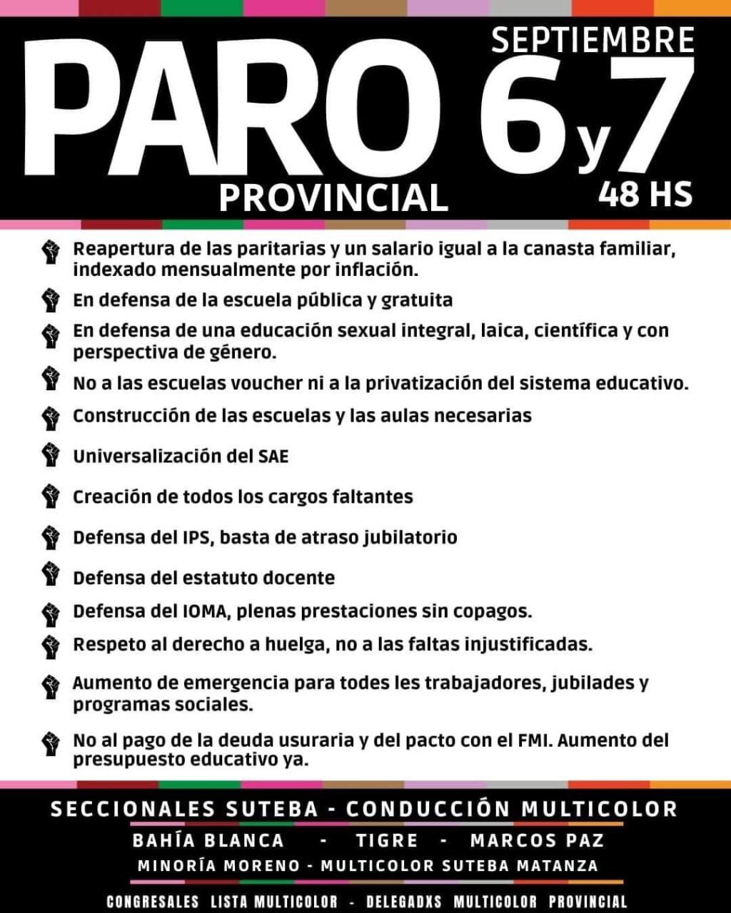 Basado en diversos reclamos como la reapertura de paritarias y la defensa de la escuela pública y gratuita, la conducción Multicolor del gremio docente bonaerense convocó a una medida de fuerza para los días 6 y 7 de septiembre. Vale resaltar que en otro de los reclamos incluye «expresar la solidaridad con la comunidad educativa del Jardín 906 y la docencia autoconvocada de Las Flores» por los hechos de conocimiento público.