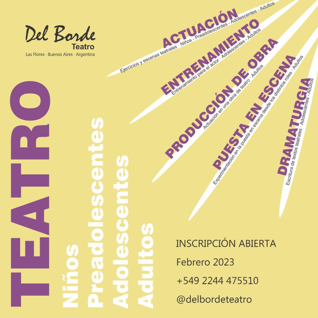 Durante el mes de febrero, se encuentra abierta la inscripción a los Talleres de Teatro Del Borde, con ofertas variadas, a las que podrán asistir personas desde los 5 años (que estén cursando sala de 5 del jardín durante 2023) hasta adultos mayores.
