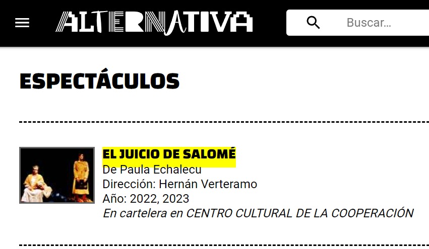 Durante los meses de marzo y abril estaremos presentándonos en el Centro Cultural de la Cooperación (Corrientes 1543, CABA) (https://www.centrocultural.coop) todos los sábados a las 22.30 con nuestra obra “El juicio de Salomé”. «Para nosotros, esto es importantísimo. Significa un enorme reconocimiento a nuestro trabajo, formar parte de la cartelera de tan importante centro cultural. Estamos felices y agradecidos. Ojalá puedan acompañarnos en alguna función», postearon desde el sitio web de Teatro del Borde. El que quiera comprar entradas, puede hacerlo desde ahora, ingresando a Alternativa Teatral (https://www.alternativateatral.com/obra80538-el-juicio-de-salome).