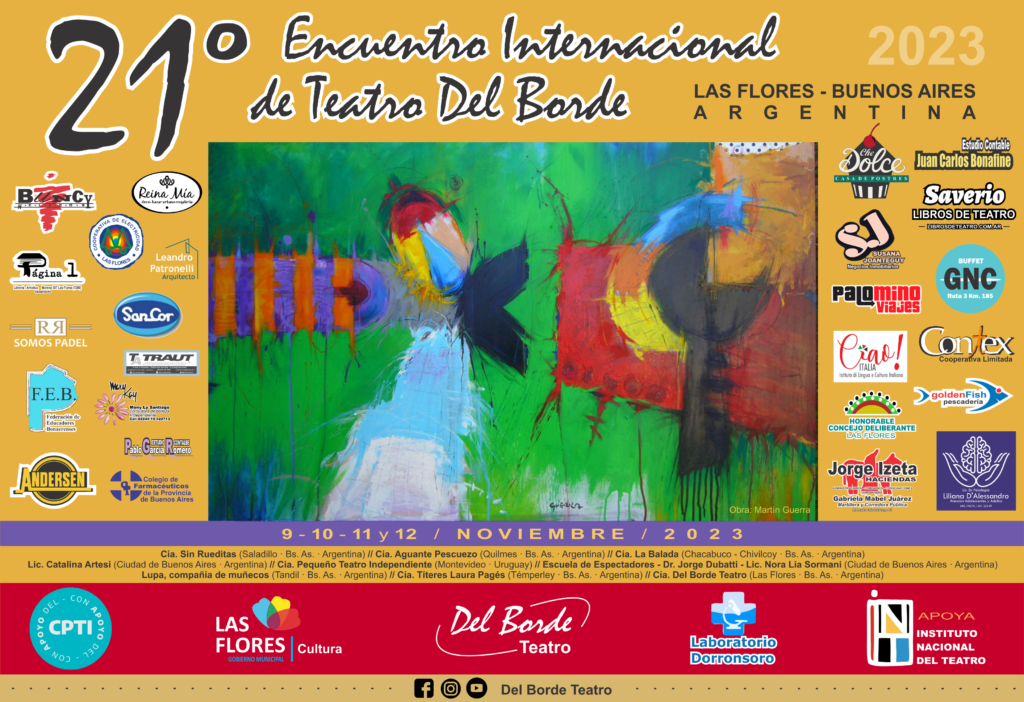 (Ver programa completo) Durante los días 9, 10 y 11 de noviembre, la comunidad de Las Flores podrá disfrutar de la 21ª Edición del Encuentro Internacional de Teatro Del Borde que contará con la participación de importantes figuras del Teatro Independiente. En esta oportunidad, se realizarán actividades en el Espacio Teatral Del Borde (Bernardo de Irigoyen 570), la Plaza Mitre (Av. San Martín y Av. Gral. Paz), la Escuela de Educación Artística Nº 1 (Av. General Paz 364), la Escuela Secundaria Nº 1 (Av. Carmen 766), la Plaza Italia (Av. Sarmiento y Av. Avellaneda), la Escuela Normal (Las Heras 577), la Pileta El Faro (Roberto Trucco s/n) y el Albergue Municipal Centro Recreativo Néstor Kirchner. La entrada a todas las actividades será libre y gratuita, ofreciéndose este año, espectáculos, instancias de intercambio, charlas y conferencias para diferentes públicos. Algunos de los participantes serán Compañía «Sin Rueditas» (Saladillo), «Aguante Pescuezo» (Quilmes) y «La Balada» (Chivilcoy/Bragado).