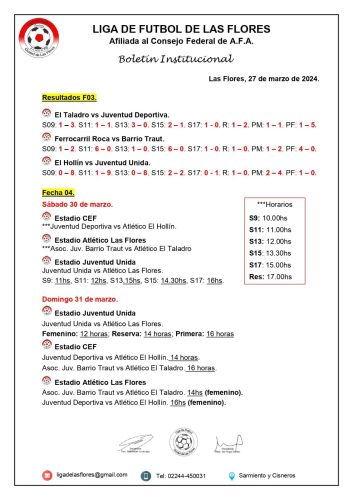 (ver cronograma) En su habitual reunión de los días martes la Liga de Fútbol confirmó el programa de partidos para el próximo fin de semana en todas las categorías como así también el Fútbol Femenino. Se destaca el encuentro que sostendrán en primera división Barrio Traut-El Taladro (domingo a las 16hs. en el Estadio del CEF Nro. 6) y Juventud Unida-Atlético (domingo a las 16hs. en el Estadio de Juventud Unida). La fecha se completará con Juventud Deportiva-El Hollín (domingo a las 14hs. en el Estadio del CEF Nro. 6). Libre estará Ferro.