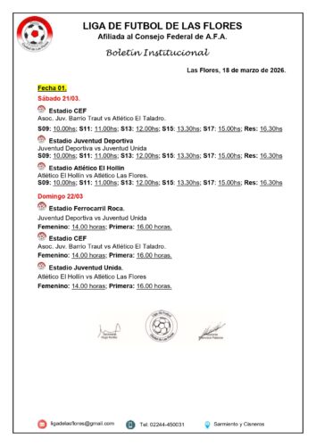 (ver cronograma de partidos) En su habitual reunión semanal la Liga de Fútbol confirmó los encuentros correspondientes a la primera fecha de la fase regular del Torneo Apertura en todas sus categorías como así también en el Fútbol Femenino. En primera división a las 16hs. en el estadio «27 de abril» jugarán el próximo domingo Juventud Deportiva-Juventud Unida. A la misma hora pero en el CEF Nro. 6 se enfrentarán Barrio Traut-El Taladro. Finalmente, también a las 16hs. chocarán El Hollín-Atlético. Libre estará Ferro. El valor de la entrada para primera división fue fijado en 7.000 pesos mientras que para las divisiones inferiores costará 5.000 pesos. Vale mencionar que la jornada dará comienzo a las 14hs. con la fecha inicial del Fútbol Femenino (mismos partidos y estadios).