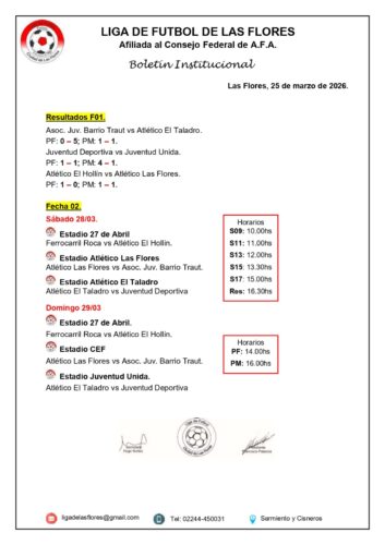 (ver cronograma de partidos) En su habitual reunión semanal la Liga de Fútbol confirmó los encuentros correspondientes a la segunda fecha de la fase regular del Torneo Apertura en todas sus categorías como así también en el Fútbol Femenino. En primera división a las 16hs. en el estadio «27 de abril» jugarán el próximo domingo Ferro-El Hollín. A la misma hora pero en el CEF Nro. 6 se enfrentarán Atlético-Barrio Traut. Finalmente, también a las 16hs. en cancha de Juventud Unida chocarán El Taladro-Juventud Deportiva. Libre estará Juventud Unida. El valor de la entrada para primera división fue fijado en 7.000 pesos mientras que para las divisiones inferiores costará 5.000 pesos. Vale mencionar que la jornada dará comienzo a las 14hs. con la segunda fecha del Fútbol Femenino (mismos partidos y estadios).