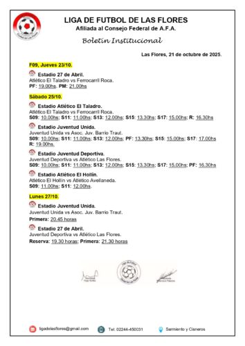 (ver programa completo) En su habitual reunión semanal la Liga de Fútbol dio a conocer el programa de partidos de todas las divisionales con la novedad que, debido a las elecciones legislativas, los encuentros de primera división se jugarán en días de semana. Así las cosas, este jueves desde las 21hs. en el estadio «27 de abril» se enfrentarán Ferro-El Taladro mientras que el próximo lunes habrá dos encuentros: a las 20:45hs. en el estadio de Juventud Unida el local recibirá a Barrio Traut mientras que a las 21:30 en el polideportivo ferroviario se medirán Juventud Deportiva y Atlético. Libre estará El Hollín.