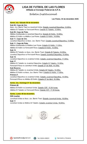 (ver cronograma de partidos) En las últimas horas la Liga de Fútbol confirmó los encuentros correspondientes a las semifinales de ida del Torneo Clausura en todas sus categorías como así también en el Fútbol Femenino. En primera división, el próximo domingo a las 15:30hs. jugarán en el estadio del CEF Nro. 6 El Hollín-Juventud Unida mientras que a las 17:30hs. en el mismo escenario lo harán El Taladro-Ferro.