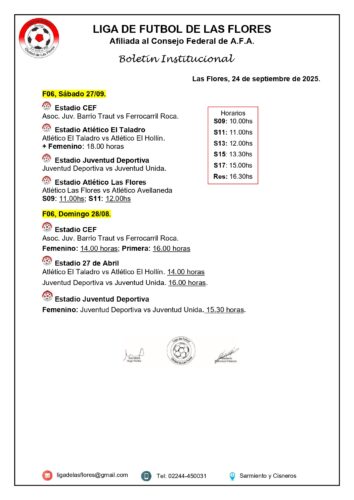 (ver programa completo) Luego de la suspensión el pasado fin de semana por lluvias el próximo domingo tendrá continuidad el torneo de primera división del fútbol local. En su reunión semanal, la entidad liguista confirmó los encuentros de la próxima fecha. En el estadio del CEF Nro. 6 jugarán desde las 16hs. Barrio Traut-Ferro. Por su parte, en el estadio «27 de abril» desde las 14hs. lo harán El Taladro-El Hollín mientras que a su término se enfrentarán Juventud Deportiva-Juventud Unida. Libre estará Atlético Las Flores. Por otro lado y debido a lo ajustado del calendario se llevaría a cabo una reunión entre los delegados de todos los clubes participantes para modificar el reglamento del torneo que sería a una sola rueda como el Apertura y no a dos ruedas como se había diagramado inicialmente.