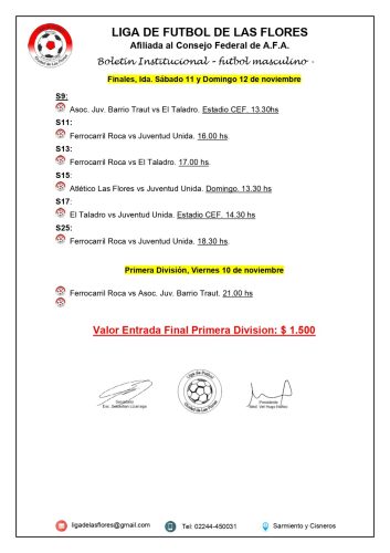 (ver programa completo) En su reunión semanal la Liga de Fútbol confirmó que la final de ida se disputará este viernes a las 21hs. en el Polideportivo de Avda. Avellaneda y Vidal debido a que el ferroviario jugará como local por el Torneo Regional Federal Amateur 2023/2024 el próximo domingo a las 19hs. ante Argentinos (25 de Mayo). También se dio a conocer el programa completo de las finales de ida de todas las categorías del fútbol local.