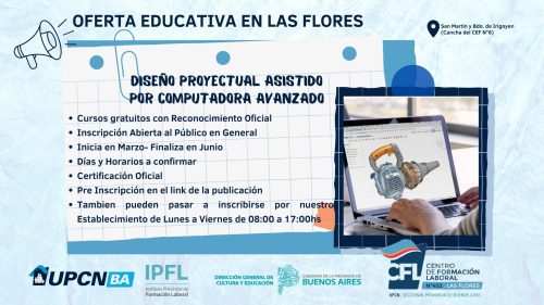 (ver flyer) A partir de marzo los interesados podrán capacitarse en Diseño Asistido por Computadora. El curso es gratuito con certificación oficial. Próximamente se confirmarán los días y horarios de cursada. Podés reservar tu lugar. Preinscripción en el link https://forms.gle/bemeq5oqPjK4pUHj9. O bien personalmente por el establecimiento ubicado en Avda. San Martin y Bernardo de Irigoyen (estadio de CEF Nº 6) de lunes a viernes de 8 hs. a 17hs.
