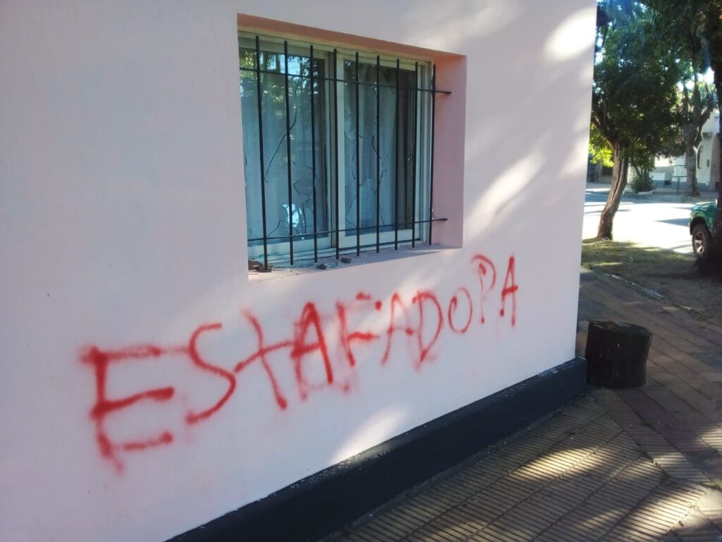 En las últimas horas desconocidos irrumpieron frente a una vivienda ubicada en calles 25 de Mayo y Dorrego donde realizaron pintadas y rompieron los vidrios de las ventanas utilizando piedras. Se desconoce si había moradores en la vivienda al momento del ataque.